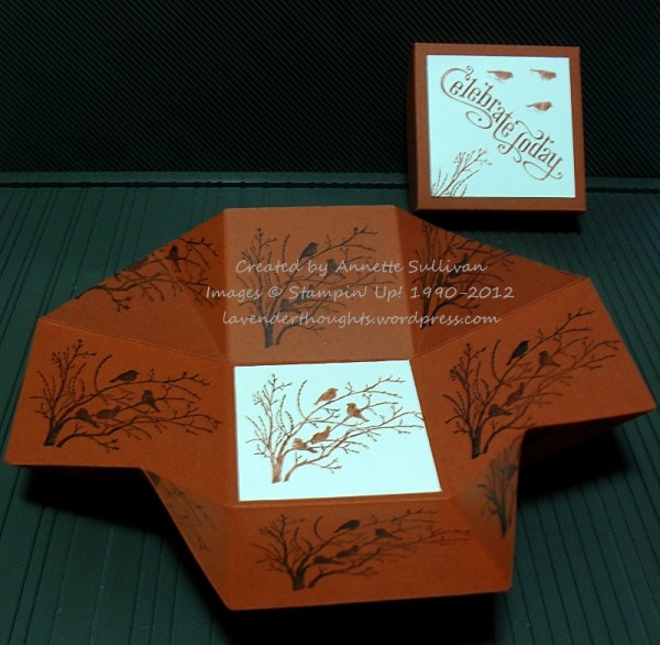 I made mine using Cajun Craze and Very Vanilla card stock. The bird and branch image from Serene Silhouettes was stamped in Stazon Jet Black on all sides, inside and out. The lid of the box was stamped in Cajun Craze with part of the branch, a few of the birds and a sentiment from Perfectly Penned.
