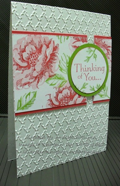 I embossed the Naturals White card base with the Fancy Fan EF. The Stippled Blossoms is a two step stamp set, so I stamped the solid flower in Pink Pirouette and the outline in Primrose Petals, and added some of the outline leaves in Lucky Limeade. This was layered onto Primrose Petals. The sentiment is from Thoughts & Prayers, and I added some of the small outline leaves from the Stippled Blossoms set before punching with the 1-3/4″ Circle Punch. This was layered on a piece of Lucky Limeade which was cut with the Circles #2 Sizzix die.