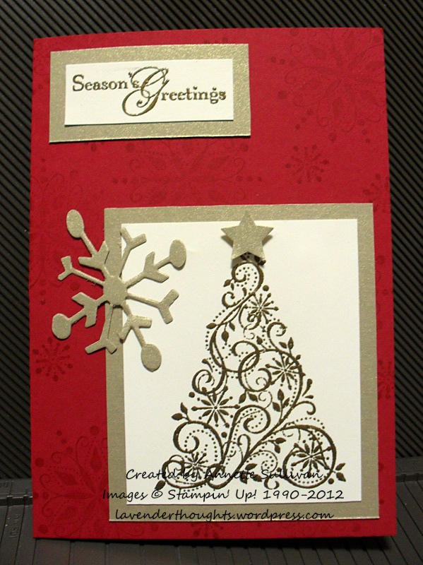 I used some of the snowflake images from Snow Swirled to crate a watermark effect on the Raspberry Ripple base. The tree image and a sentiment from Snow Swirled were stamped with Versamark on Very Vanilla and then heat embossed with Gold EP. These pieces were layered onto Brushed Gold. The snowflake was cut with the Sizzlits Snowflake #2 die [not SU] from Brushed Gold, and the star was punched from the Merry Minis Punch Pack.