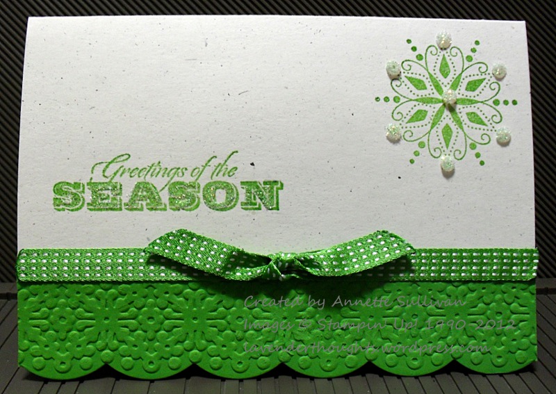 The base card is Naturals Ivory, stamped with images from Come to Bethlehem, Snow Swirled and Greetings of the Season and then clear embossed . Ribbon is 3/8″ Satin Stitched from the 2012-2014 In Color Collection. I have used two of the new In Colors.