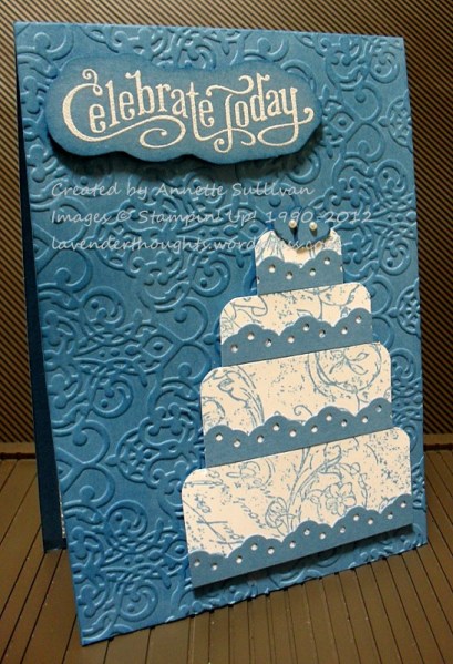 I used Marina Mist for the base card stock and ran it through the Big Shot with the Lacy Brocade TIEF and then lightly sponged the raised areas with Marina Mist. The Whisper White piece was rolled with the Very Vintage Jumbo Wheel and then cut to create the cake. The retired Eyelet Border Punch cut the icing edges, and the Heart to Heart Punch created the hearts on top of the cake. I have used two small pearls on the hearts. The sentiment from Perfectly Penned was inked with Whisper White Craft Ink and heat embossed with White EP. I then cut around it and sponged the edges before adding to the card with dimensionals.