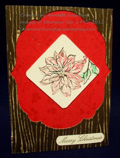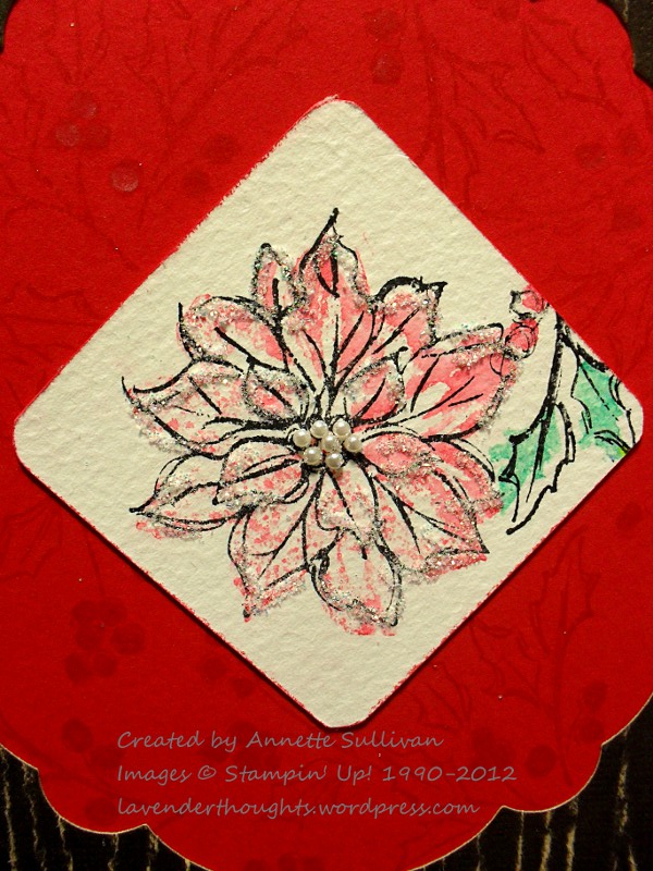 To complete my card, I stamped the holly and berry image with Versamark on the front of a Real Red card base. The berries were then coloured in with a Versamarker to give them some depth. I then took a piece of Early Espresso Core’dinations which was a negative piece from a Labels Framelit, embossed it with the Woodgrain TIEF, sanded it to get a distressed look, and added it to the front of the card. The corners of the focal image on the watercolour paper were punched with the corner rounder punch, edged with the red crayon and added to the centre of the panel. Some small Basic Jewel Pearls were added to the middle of the flower, and touches of Dazzling Diamonds glitter added around the edges of the petals to give it a sparkle. A sentiment from Come to Bethlehem was stamped in Early Espresso on Very Vanilla, punched with the Word Window punch and adhered to the bottom corner of the woodgrain piece.