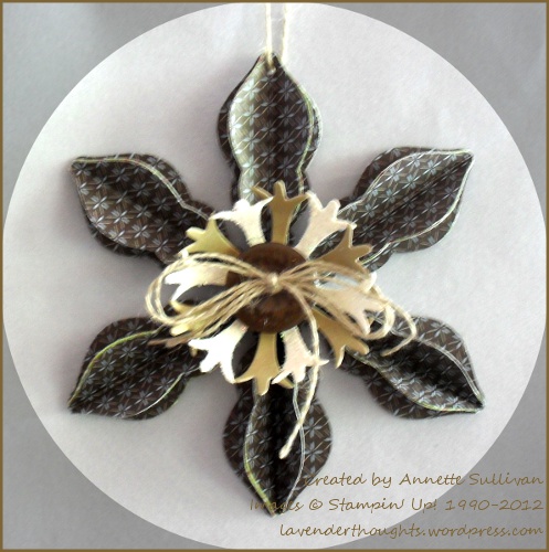 The first one is the paper bow. I used Festival of Prints DSP and have shown it here sitting on one of the Kraft Gift Boxes [#124106 on page 161 in the main catalogue – 4 boxes for $4.95]. It took no time at all to make following the instructions in the tutorial. In the new year, I will make some smaller ones to share with you.
