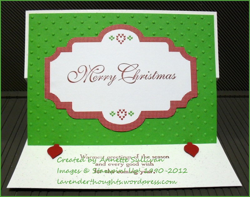 It has a Naturals White base and the Gumball Green piece has been embossed with the Perfect Polka Dots TIEF. Sentiments are from Greetings of the Season [outside] and Many Merry Messages [inside]. The little Cherry Cobbler ornaments were punched with the Merry Minis Punch Pack.