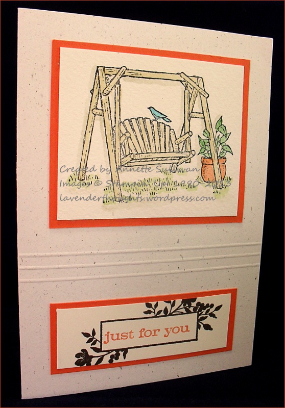 Today’s card uses the swing image. I stamped it with Stazon Jet Black on Watercolour Paper and coloured it using inks and a Blender pen. This was then layered onto Tangerine Tango and added to a base of Naturals White. The Simply Scored tool was then used to create three lines under the swing image. Images from Just Believe were stamped in Early Espresso and Tangerine Tango on Very Vanilla, layered onto Tangerine Tango and added it to the bottom section of the card.