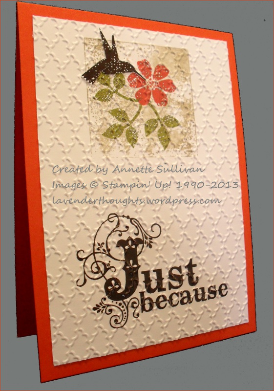 I printed the flower in Tangerine Tango, the leaves in Lucky Limeade and the sentiment in Early Espresso on a piece of Whisper White. I inked a small acrylic block with Crumb Cake, spritzed it with water and stamped it over the flower and leaves. I then embossed it with the Fancy Fan TIEF. The hummingbird was printed in Early Espresso on a separate piece of Whisper White, fussy cut and added to the flower. This was then layered onto a base of Tangerine Tango.