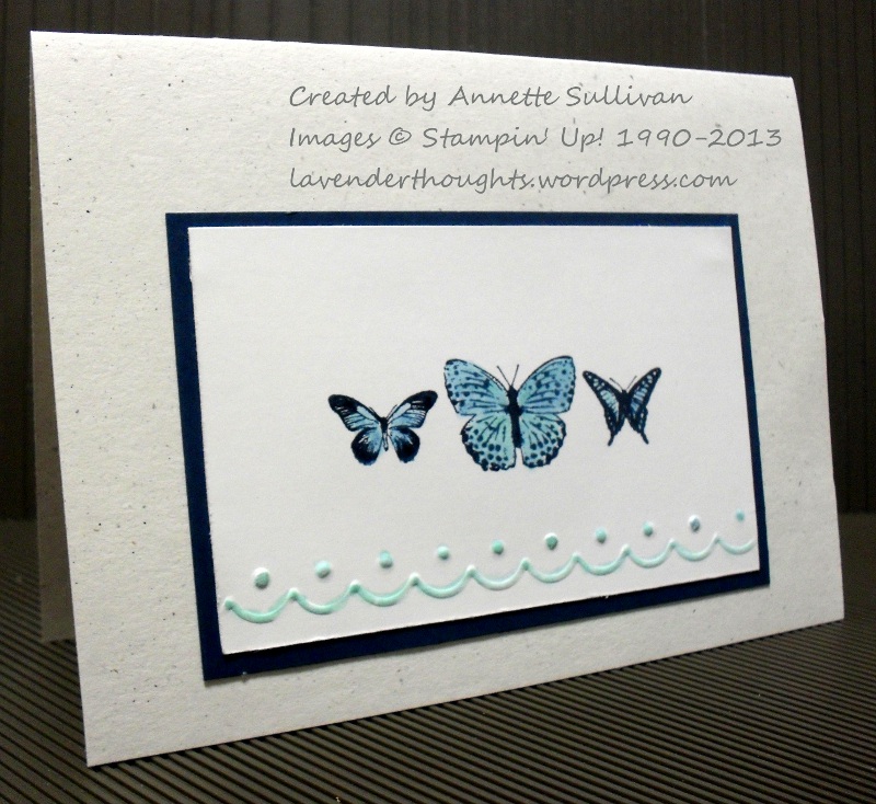 I used a base of Naturals White, layered with Midnight Muse and Whisper White. The Whisper White layer was stamped in Midnight Muse with the butterflies from Kindness Matters. The image was then coloured with Pool Party and a Blender Pen. I kept Bonnie’s idea of the border using the new Simply Scored Borders Scoring Plate (sneak peek from the Seasonal Catalogue coming out on 1 February). The scored scallops and dots were then coloured with Pool Party and a Blender Pen.