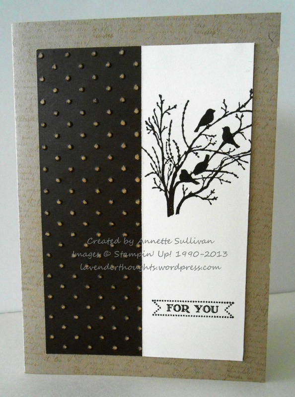 The base card of Crumb Cake was stamped with the script image from French Foliage to add some background. A piece of Early Espresso Core’dinations was embossed with the Perfect Polka Dots TIEF and sanded to reveal the different coloured core. The birds and branch image from Serene Silhouettes was stamped in Early Espresso on Very Vanilla, and the sentiment is from Itty Bitty Banners.