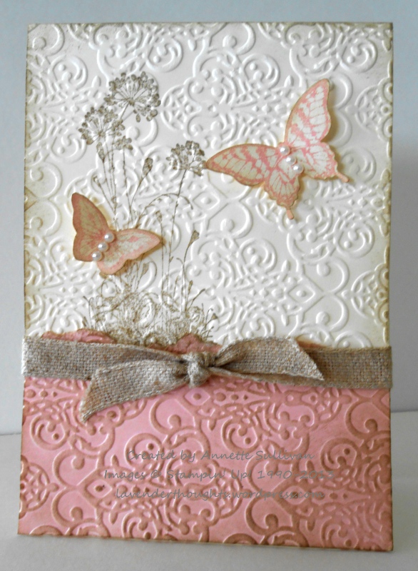 The base of Very Vanilla was stamped with the “flower head” image from Serene Silhouettes and then it and a piece of Pink Pirouette were embossed with the Lacy Brocade TIEF. Both pieces were sponged with Crumb Cake and then the pink piece was torn across the top. The tear lines on both pieces of the pink were also sponged with Crumb Cake. Butterflies from Papillon Potpourri were stamped with Pink Pirouette on Very Vanilla and then the small one was fussy cut [the punch for that one is still on my wish list], and the larger one punched with the Elegant Butterfly punch. Some Basic Jewel pearls were added to the butterflies before they were adhered to the card with dimensionals. A piece of the new Natural Trim ribbon was knotted across the front.