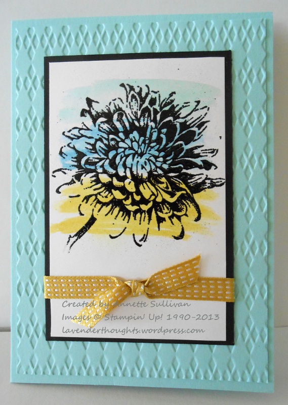 The base card stock is Pool Party, as is the Argyle TIEF embossed layer. The flower from Blooming with Kindness was heat embossed with black EP on Shimmery White card. [Note to self – use this card stock more. It gives a great finish.] Using an Aqua Painter and some Summer Starfruit, Marina Mist and Pool Party inks, I washed across the embossed image. Summer Starfruit Satin Stitched ribbon was added across the panel after it was layered onto Basic Black. I have left room at the base of the Shimmery White panel to add a sentiment.
