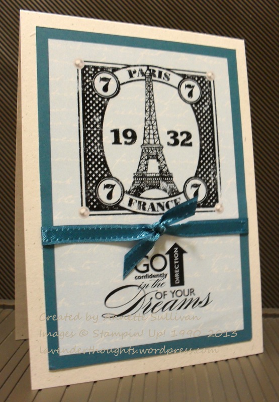 Another great use of MDS is that the images can be resized. With the real Paris image, it is only 1¼” square. I have resized it to 2½” square with absolutely no loss in quality. Imagine the possibilities with other images. The MDS projects were printed on Whisper White, wrapped with ribbon [Island Indigo Sycamore Street bundle and Rich Razzleberry ¼” Stitched Grosgrain] and then mounted on Naturals White [even though one of the photos looks blue].