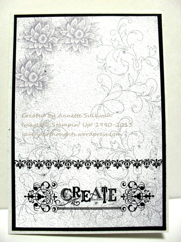 The MDS part on the second card uses Vintage Overlays DSP and Creative Elements stamps. I ‘stamped’ the flowers in the top left hand corner with Wisteria Wonder, reducing the opacity to give a muted look. After printing on Whisper White, this was layered with Basic Black on a base of Naturals White.