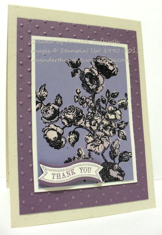 A piece of Wisteria Wonder was stamped in Versamark with the flowers from Elements of Style, and then heat embossed with Black EP. I then used a fine brush and added bleach onto the image. On the Wisteria, the bleached parts turned a pale pink. I layered this onto Very Vanilla, and Perfect Plum embossed with the Perfect Polka Dots TIEF before adding to a Naturals Ivory base. The sentiment from Itty Bitty Banners was stamped in Perfect Plum on Very Vanilla and cut with a Bitty Banners Framelit. This was layered onto Perfect Plum which had been cut with the same Framelit.