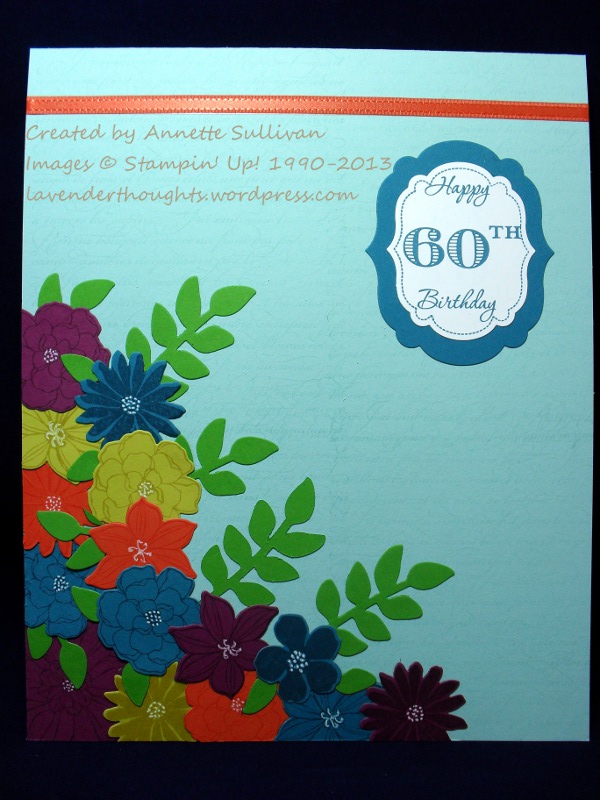 Secret Garden was the perfect stamp set for this one. I stamped flowers from the set tone on tone with Summer Starfruit, Island Indigo, Rich Razzleberry and Tangerine Tango, and then cut them with the matching framelits. The leaves were cut using Gumball Green. These were all arranged in a large bouquet around the bottom left hand corner of the A4 Pool Party Card. A piece of Tangerine Tango ribbon from the Sycamore Street collection [retired SAB] was placed along the top. The sentiment from Memorable Moments was inked in Island Indigo on Whisper White and cut with a Labels Framelit. The next size label was cut with Island Indigo to create a layered effect.