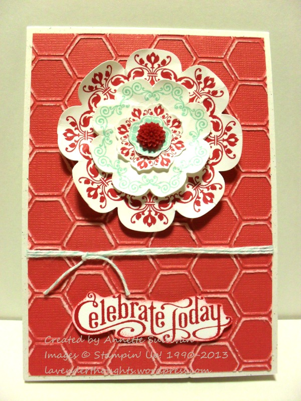 I took a piece and ran it through the Honeycomb TIEF and lightly sanded it to bring out the core colours. Some images from Daydream Medallions [also a recent purchase] were stamped in Raspberry Ripple and Pool Party on Whisper White, and then cut with the matching Floral Frames Framelits.The flowers were layered with Glue Dots and topped with a matching In Color Dahlia. After wrapping some Pool Party Baker’s Twine around the Primrose Petals piece, I layered it onto a Naturals White card base. The sentiment from Perfectly Penned was stamped in Raspberry Ripple ink on Whisper White, fussy cut, sponged and added to the card with dimensionals.