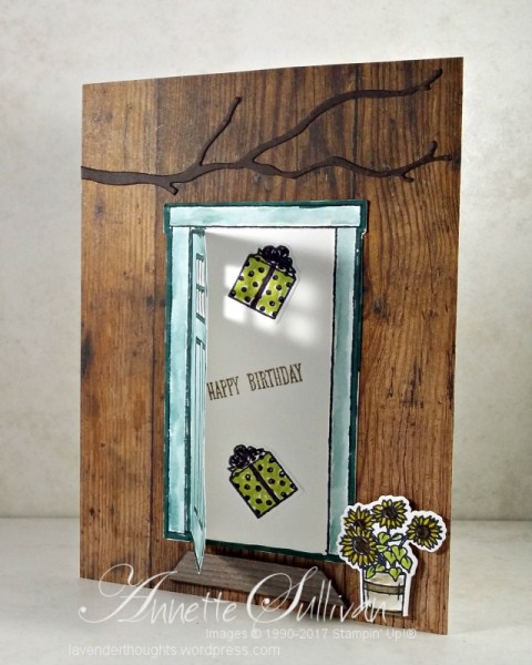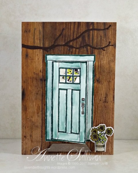 The card base is Thick Whisper White with a piece of the Wood Textures DSP to represent the house. The mat at the door is also from the same DSP. The door is watercoloured with Tranquil Tide. The sunflowers image was coloured with Crushed Curry, Early Espresso and Soft Suede. The branch above the door has been cut with one of the Seasonal Layers Thinlits.