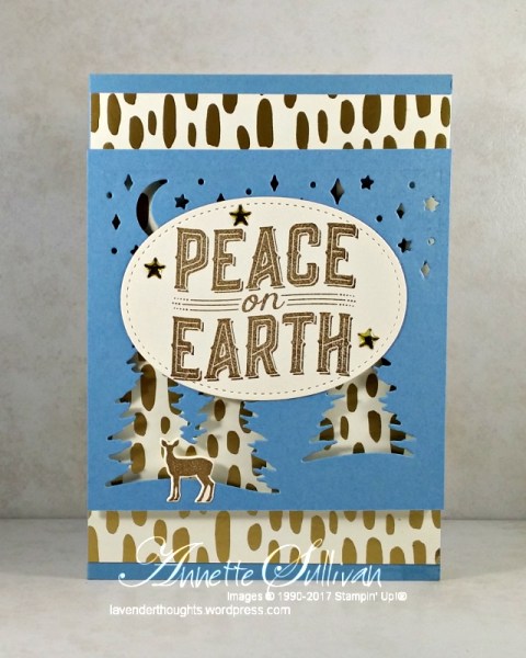 Non-traditional colours are used for this last card. The base is Marina Mist with a layer from the Bundle of Love Specialty DSP. The cute little die cut deer and the sentiment have been stamped in Soft Suede. Look at the die cut trees and the die cut header of stars and moon. Once again, these dies could be used for any occasion – baby, birthday, congratulations.