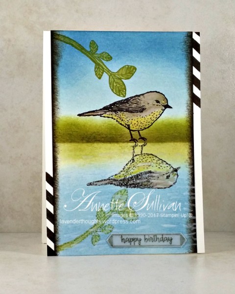 - The reflections of the bird and branch are created by stamping the image onto an acetate or Stamp-a-ma-jig sheet, positioning where you want the reflected image and then lightly rubbing the sheet to transfer the ink to the art panel.