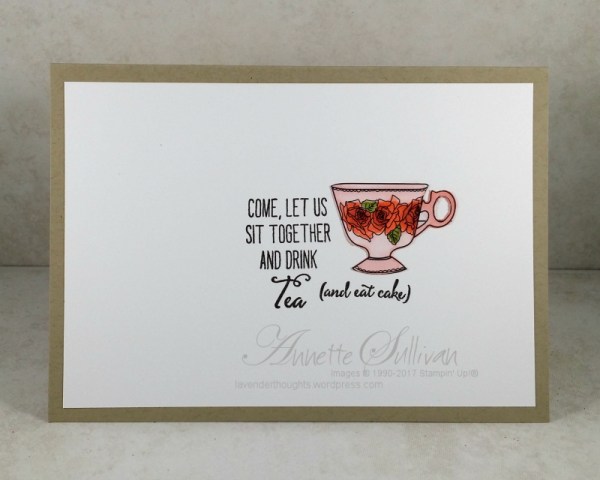 - I used Ivory, Bronze, Night of Navy, Crumb Cake, Old Olive, Pink Pirouette, Calypso Coral and Daffodil Delight Blends, as well as the Color Lifter to add texture to the tablecloth and definition to the tea pot.