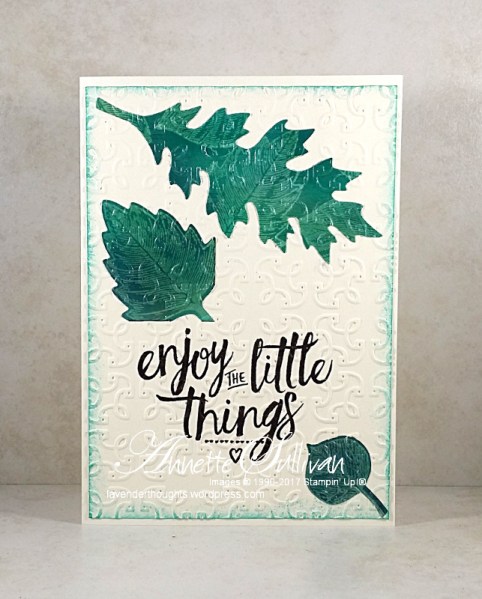 - This one is a little different. I have die cut the Ghosting leaves, added them to the Very Vanilla before embossing the panel to create an Inlaid / Embedded Embossing look.