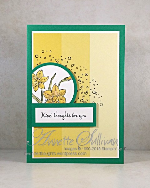 - Stamp the daffodils with Basic Black Archival ink on Whisper White cardstock. Colour the flowers with Watercolor Pencils – Calypso Coral and Daffodil Delight and the stems and leaves with Old Olive. Use a Blender Pen to blend the colours.