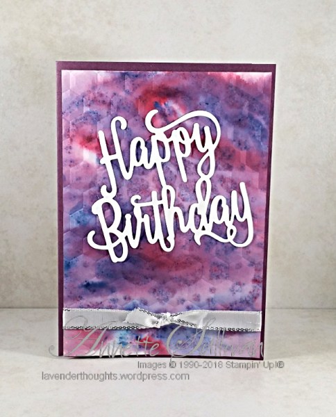 - Die cut Whisper White cardstock with the Happy Birthday Thinlits, attach to the Brusho panel and add Clear Wink of Stella (alternatively use Shimmery White for the die cut).