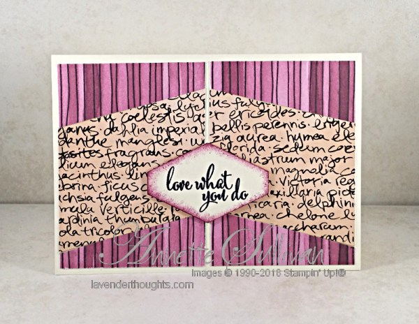 I have used the Love What You Do stamp set and the Share What You Love Specialty Designer Series Paper, which I have been able to purchase early from the Annual Catalogue which will go live on 1 June 2018. This is one of the perks of being a demonstrator. More about this early release in a day or so.