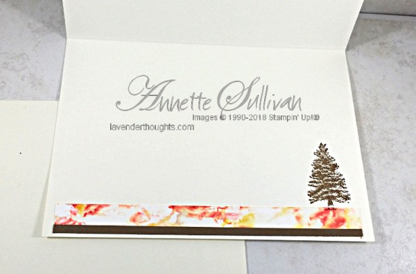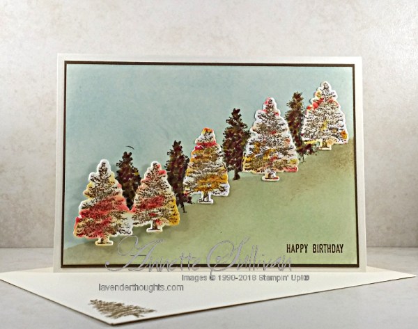 - Sponge a piece of Whisper White cardstock with Soft Sky and Soft Sea Foam to create a background. Stamp some trees from Rooted in Nature using Soft Suede ink. Add the die cut trees with Dimensionals in front of the stamped images. Add a sentiment.