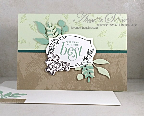 - Stamp a sentiment in the leaf frame using Soft Sea Foam ink.