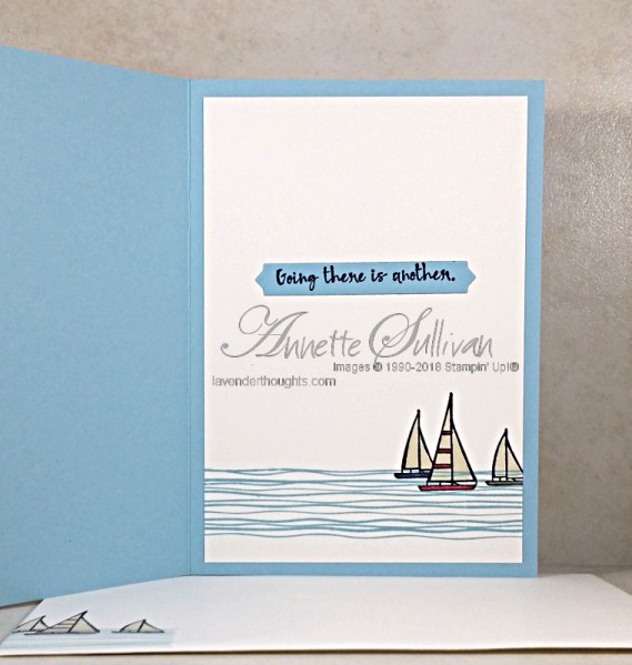 - Take a piece of Whisper White and stamp the water three times across the middle using Balmy Blue ink. Attach to a Balmy Blue card base.
