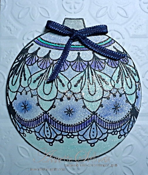 - The ornament was stamped on Shimmery White with Memento Tuxedo Black ink. Colour was added with the Watercolor Pencils and blended with the Clear Wink of Stella.