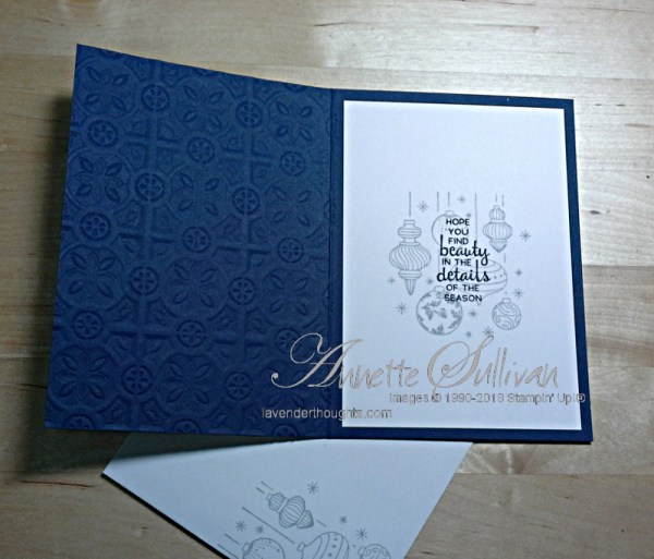 - Accessories: Tin Tile Dynamic Textured Impressions Embossing Folder, Clear Wink of Stella, 1/8″ Whisper White Sheer Ribbon (coloured with Night of Navy Stampin’ Blends), Watercolor Pencils: Night of Navy, Balmy Blue, Coastal Cabana, Gorgeous Grape