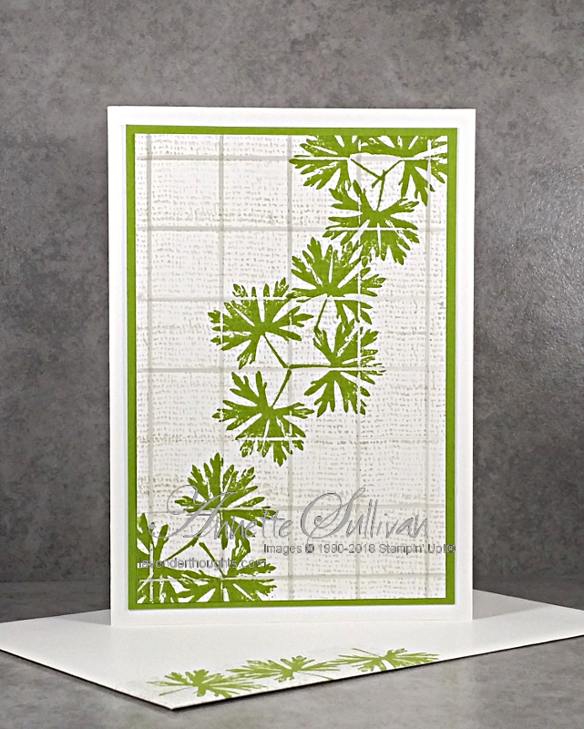 - Stamp background image with Sahara Sand ink (second generation stamping) and the main images with Granny Apple Green ink to create a tile look. The images will not stamp in the grid lines.