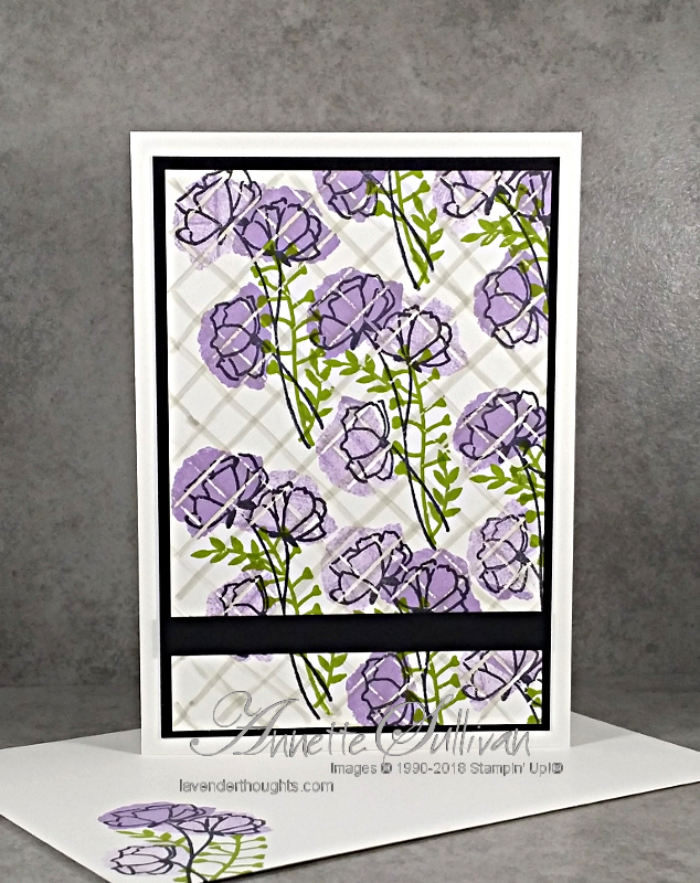 - Stamp images with Highland Heather and Granny Apple Green inks to create a tile look. The images will not stamp in the grid lines.