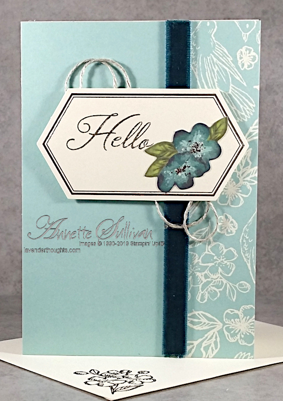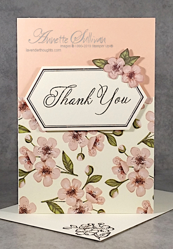 - Flowers were stamped second generation in each corner of the Very Vanilla Note card before adding the label panel on an angle.