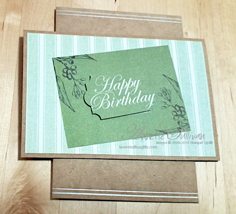 This one also uses two of the cards. I punched the Happy Birthday with the Everyday Label Punch and raised it on Dimensionals. The inside has a die cut from the pack. I created a border with the Basic Black marker.