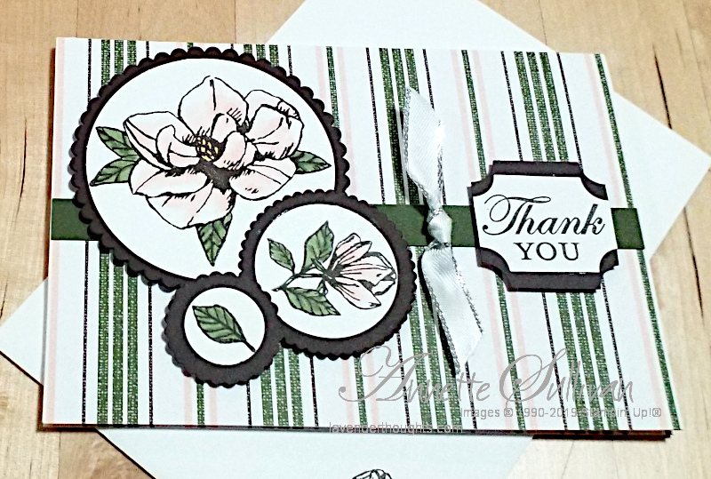 - I have combined the stamps from Magnolia Blooms with some pretty striped Magnolia Lane Designer Series Paper from the Annual Catalogue.