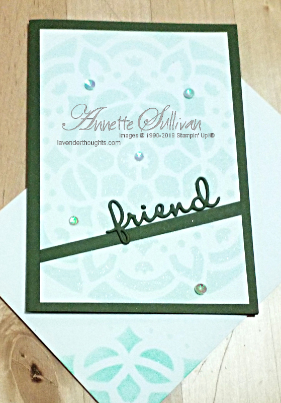 - Die cut ‘friend’ from Mossy Meadow cardstock and the Well Written Die.