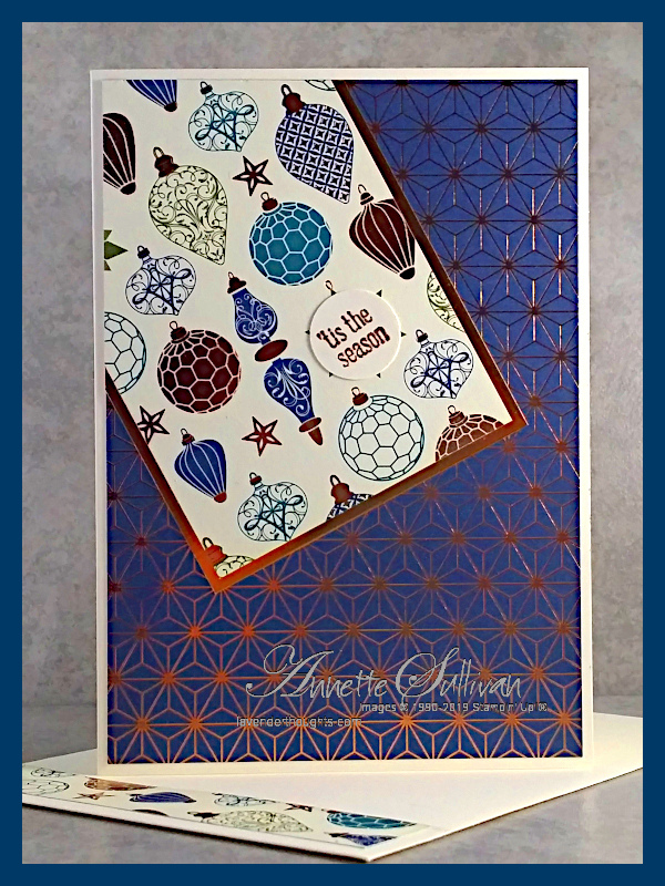 - The sentiment was stamped on Very Vanilla with Versamark ink, heat embossed with Copper Embossing Powder and punched with the ¾” Circle Punch. It was then attached to the ornament DSP over a star shape. You can just see the points of the star coming out behind the sentiment.