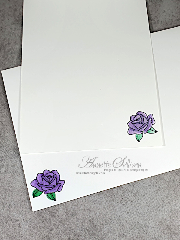 - The roses have been coloured with Highland Heather and Call Me Clover Stampin’ Blends and attached to a circle of Call Me Clover.