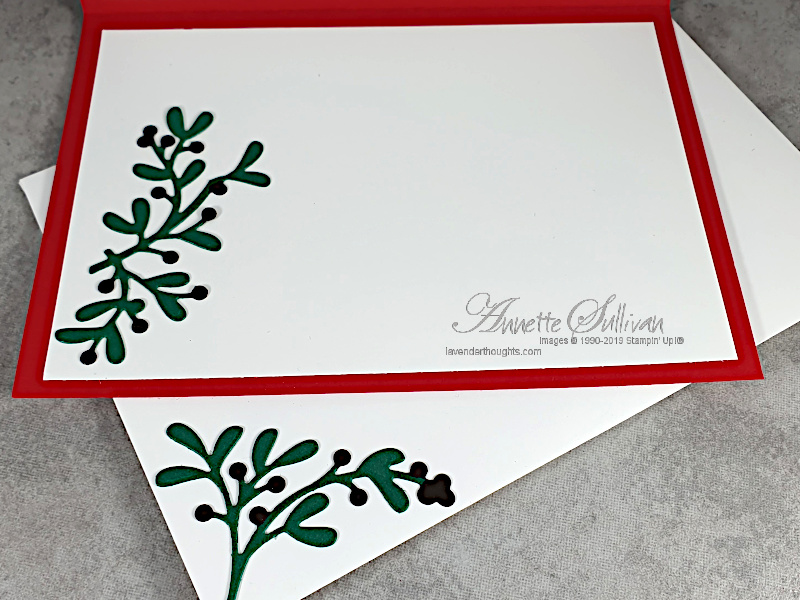 - Cut the Spruce sprig. Attach part of it to the large white piece and add to the inside of the card. Attach the other part of the sprig to the front of the envelope.