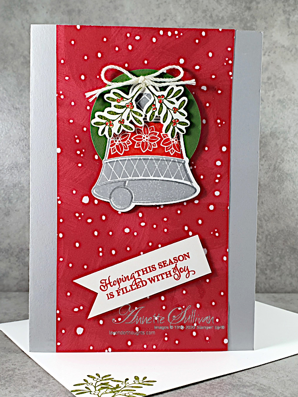 - All three of the bells have been stamped with Smoky Slate ink on Whisper White cardstock. The flower band uses Poppy Parade ink.