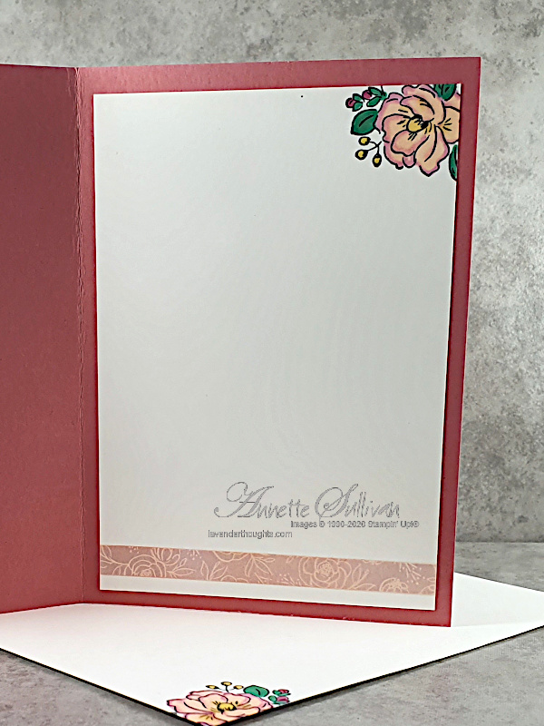 - The roses are from the cake in the Happy Birthday to You stamp set available for FREE during Sale-A-Bration with a qualifying order. They were coloured with Stampin’ Blends, fussy cut and attached to a piece of Petal Pink cardstock.