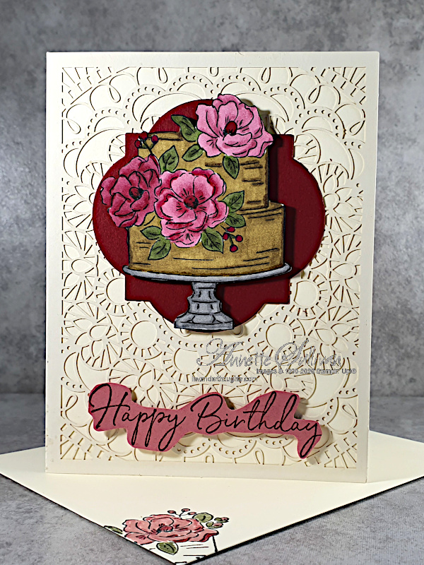 - The birthday cake is from one of the FREE stamp sets available during Sale-A-Bration with qualifying sales. I coloured it with Stampin’ Blends, fussy cut it and attached to a die cut from the retired Window Frames Framelits.