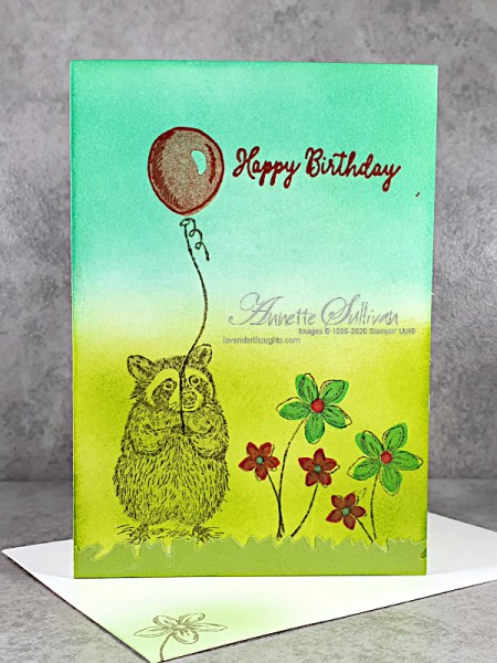 - The background was sponged with Coastal Cabana and Granny Apple Green before stamping the raccoon, flowers and sentiment. Die cut grass from the coordinating Special Day Dies adds the final touch.