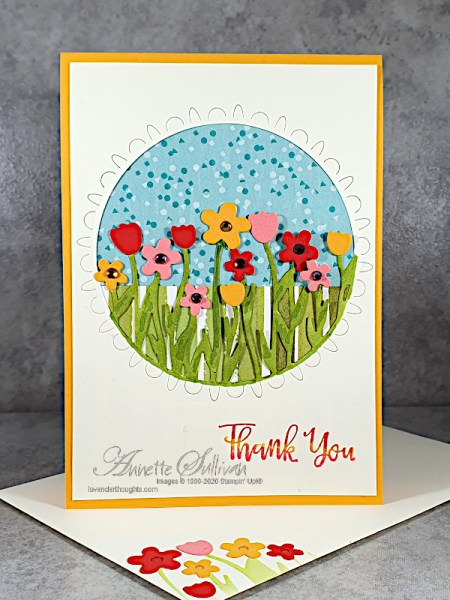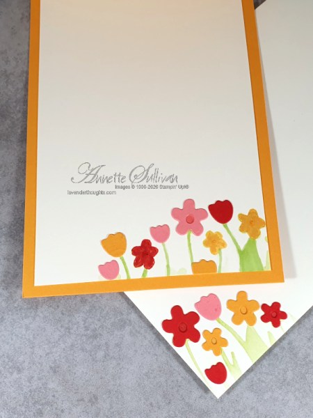 - The die cut was done with Very Vanilla cardstock. The grass and stems were coloured with Old Olive Stampin’ Blends. The flowers were die cut with Mango Melody, Flirty Flamingo and Poppy Parade cardstock and attached to the vanilla die cut.