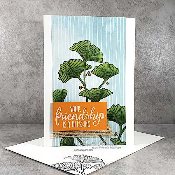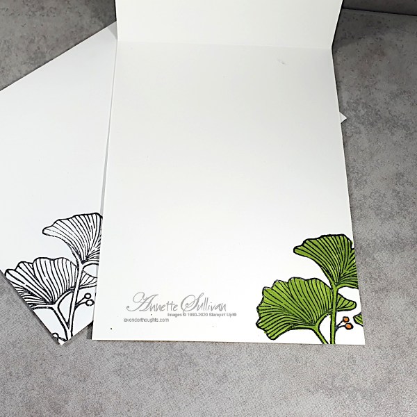 - The gingko image from Beautifully Braided was stamped on Peaceful Poppies Designer Series Paper with Memento Tuxedo Black ink and coloured with Stampin’ Blends.