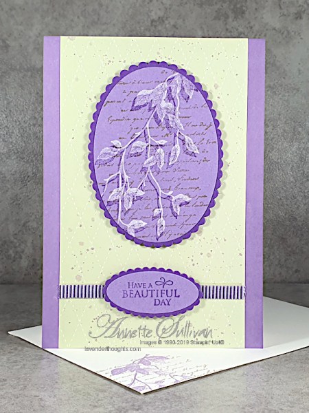 - Accessories: Layering Ovals Dies, ¼” Gorgeous Grape Mini Striped Ribbon, Dimensionals, Aqua Painter