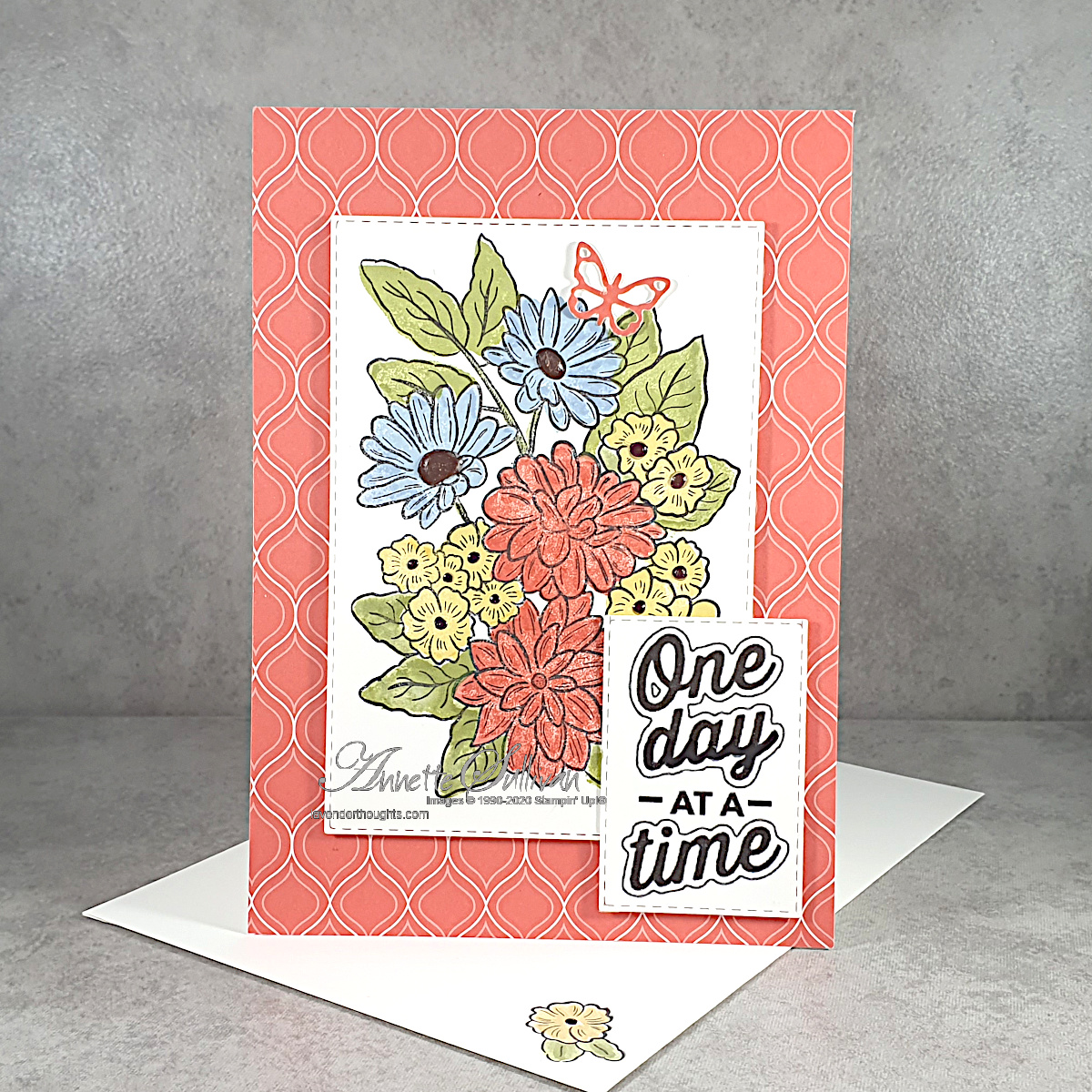 - Add Calypso Coral DSP to a Thick Whisper White card base and attach coloured image to the card front. Add butterfly and sentiment of choice.