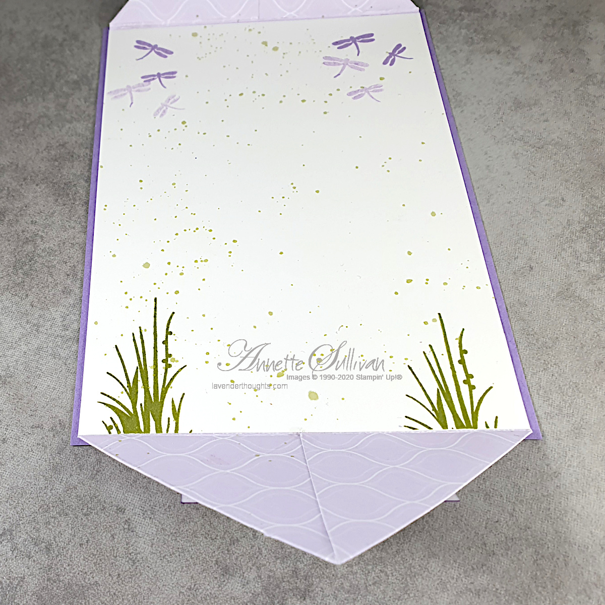 - OPTIONAL: stamp a small sentiment and attach with dimensionals to the bottom piece of DSP so that the point of the die cut panel slips in behind it.